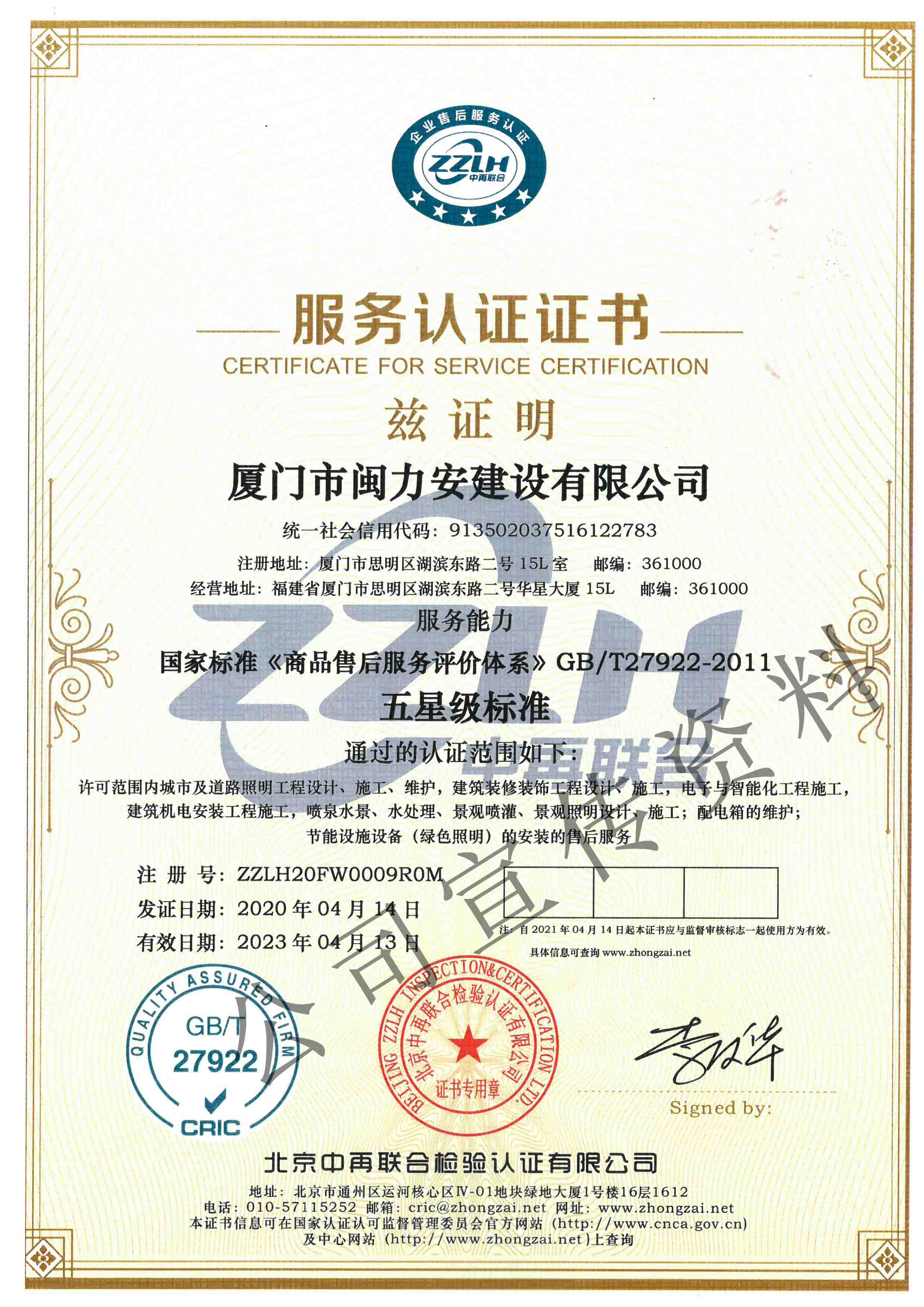 廈門市閩力安建設(shè)有限公司成立于2003年,公司取得市政公用工程施工總承包貳級、建筑裝修裝飾工程專業(yè)承包壹級、城市及道路照明工程專業(yè)承包壹級、電子與智能化工程專業(yè)承包貳級、消防設(shè)施工程專業(yè)承包貳級、電力工程施工總承包叁級、建筑機電安裝工程專業(yè)承包叁級、輸變電工程專業(yè)承包叁級、環(huán)保工程專業(yè)承包叁級、照明工程設(shè)計專項甲級、建筑裝飾工程設(shè)計乙級、施工勞務(wù)等資質(zhì)的綜合型企業(yè),公司于2013年通過了ISO9001質(zhì)量體系認(rèn)證,ISO14001環(huán)境管理體系認(rèn)證,OHSAS18001職業(yè)健康安全管理體系認(rèn)證。